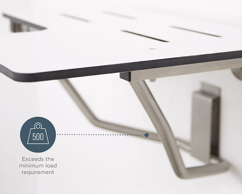 With a reversible design in Left or Right-Hand configurations, this sturdy, water-resistant seat provides secure support for up to 1,000 lbs. when properly installed. It features a solid, phenolic seat with adjustable, swing-down legs that raise the seat to the 17-19″ minimum height required to meet ADA guidelines. Seachrome uses exclusive patented easy Lift-Assist Technology to offer our customers the ability to lift any seat regardless of size or top material using only 5 lbs. of force, meeting ADA code (309.4 Operation). Lift-Assist Technology dramatically helps people with limited mobility, trouble standing, or the elderly embracing a Living in Place Lifestyle.