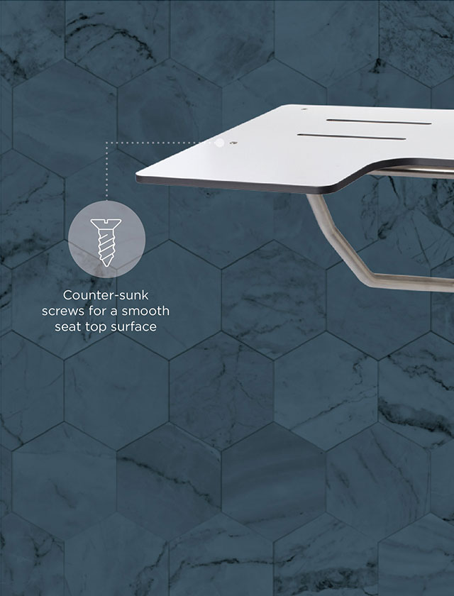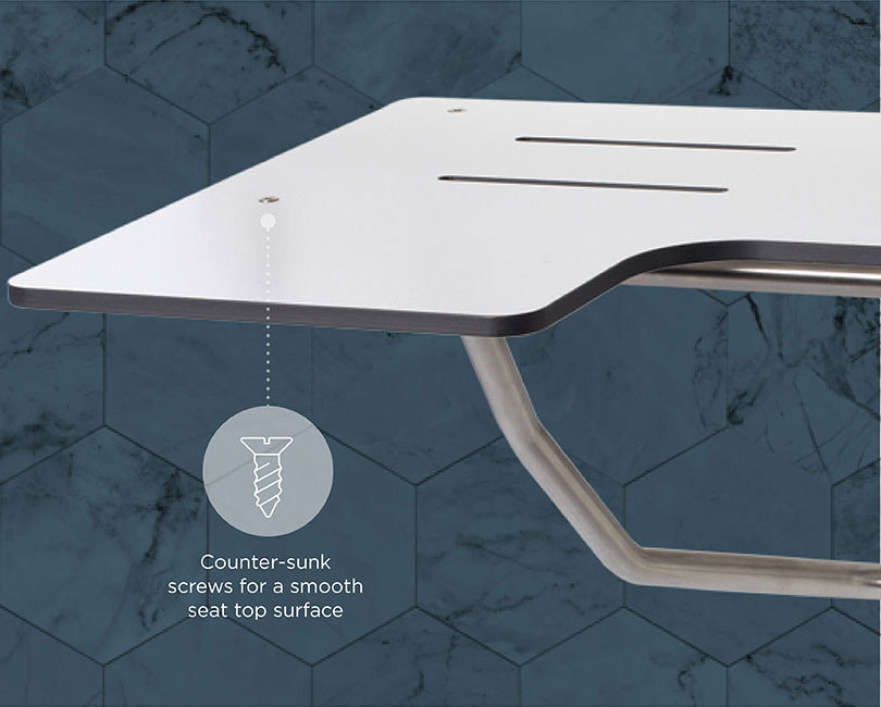 A sturdy, water-resistant seat that provides secure support. It features a solid, phenolic seat top or Naugahyde cushion seat top with adjustable, swing-down legs that raise the seat to the 17-19″ minimum height required to meet ADA guidelines. It is available in Left or Right-Hand configurations and supports up to 1,000 lbs. when properly installed. Seachrome uses exclusive patented easy Lift-Assist Technology to offer our customers the ability to lift any seat regardless of size or top material using only 5 lbs. of force, meeting ADA code (309.4 Operation). Lift-Assist Technology dramatically helps people with limited mobility, trouble standing, or the elderly embracing a Living in Place Lifestyle. Custom sizes and finishes are available to meet your design specifications.