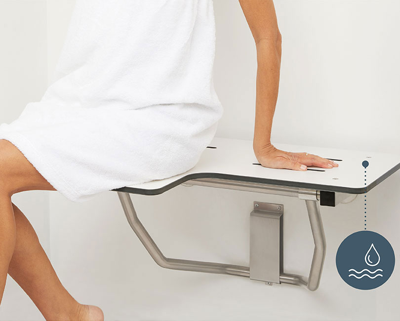 A sturdy, water-resistant seat that provides secure support while bathing. It features a solid, phenolic seat top or Naugahyde cushion seat top. It is available in Left or Right-Hand configurations and supports up to 500 lbs. when properly installed. Seachrome uses exclusive patented easy Lift-Assist Technology to offer our customers the ability to lift any seat regardless of size or top material using only 5 lbs. of force, meeting ADA code (309.4 Operation). Lift-Assist Technology dramatically helps people with limited mobility, trouble standing, or the elderly embracing a Living in Place Lifestyle.